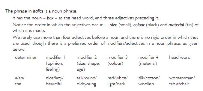 • We rarely use more than four adjectives before a noun and there is no rigid order in which they are used, though there is a preferred order of modifiers/adjectives in a noun phrase, as given below.