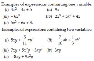 Give five examples of expressions containing one variable and five examples of expressions containing two variables.