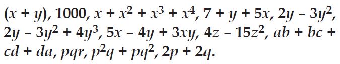 (p, q); (10 m, 5n); (20x2, 5y2); (4x, 3x2); (3mn, 4np).