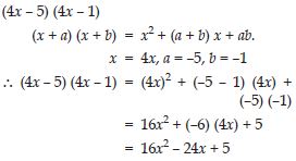 Use the identity (x + a) (x + b) = x2 + (a + b) x + ab to find the following product: (4x – 5) (4x – 1)