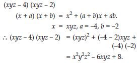 Use the identity (x + a) (x + b) = x2 + (a + b) x + ab to find the following product: (xyz – 4) (xyz – 2)