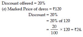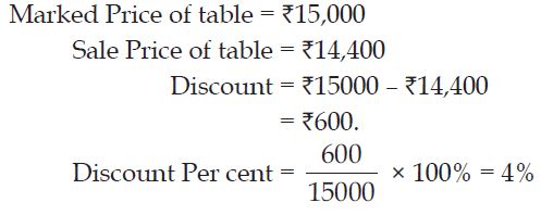 A table marked at ₹15,000 is available for ₹14,400. Find the discount given and the discount per cent.