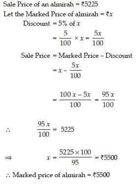 An almirah is sold at ₹5225 after allowing a discount of 5%. Find its marked price.