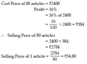 A shopkeeper buys 80 articles for ₹2,400 and sells them for a profit of 16%. Find the selling price of one article.