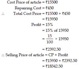 The cost of an article is ₹15,500. ₹450 were spent on its repairs. If it is sold for a profit of 15%, find the selling price of the article.