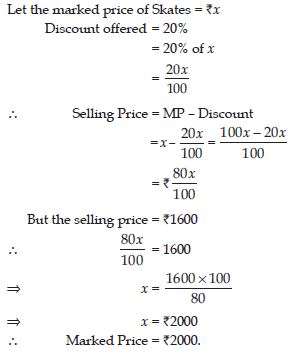 Arun bought a pair of skates at a sale where the discount given was 20%. If the amount he pays is ₹1,600, find the marked price.