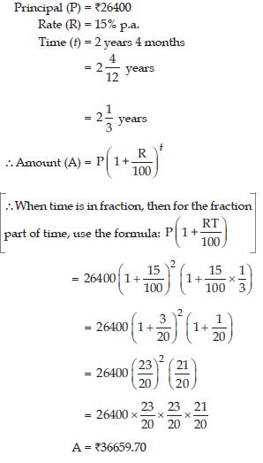 Kamla borrowed ₹26,400 from a bank to buy a scooter at a rate of 15% p.a. compounded yearly. What amount will she pay at the end of 2 years and 4 months to clear the loan?