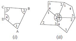 Take four congruent card-board copies of any quadrilateral ABCD, with angles as shown fig (i). Arrange the copies as shown in the figure, where angles 1 + 2 + 3 + 4 meet at a point as shown in fig. (ii)