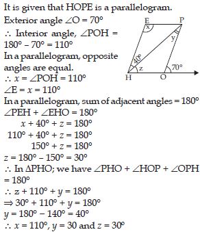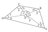 Take any quadrilateral ABCD shown in figure. Let P be any point in its interior. Join P to vertices A, B, C and D. In the figure, consider PAB. From this we see x = 180 – m2 – m3; similarly from PBC, y = 180 – m4 – m5, from PCD, z = 180 – m6 – m7 and from PDA, w = 180 – m8 – m1.