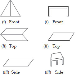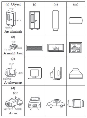 For each of the given solid, the two views are given. Match for each solid the corresponding top and front views. The first one is done for you.