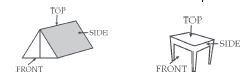 Draw the front view, side view and top view of the given objects.