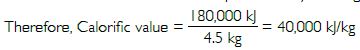 In an experiment 4.5 kg of a fuel was completely burnt. The heat produced was measured to be 180,000 kJ. Calculate the calorific value of the fuel.