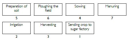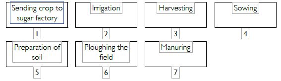 Arrange the following boxes in the proper order to make a flow chart of sugarcane crop production.