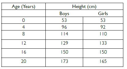 The table below shows the data on the likely height of boys and girls as they grow in age. Draw graphs showing the height and age for both boys and girls on the same graph paper. What conclusions can be drawn from these graphs?