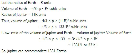 The radius of Jupiter is 11 times the radius of the Earth. Calculate the ratio of the volumes of Jupiter and the Earth. How many Earths can Jupiter accommodate?