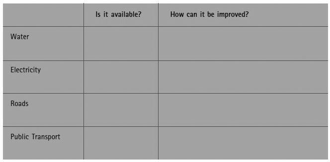 Take some of the public facilities in your area, such as water, electricity, etc. Is there scope to improve these? What in your opinion should be done? Complete the table.