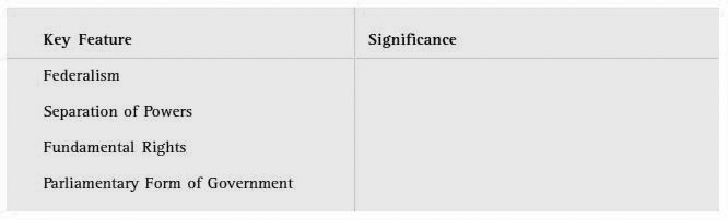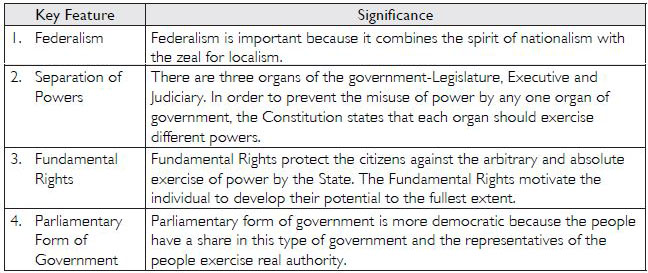 The column on the left lists some of the key features of the Indian Constitution. In the other column write two sentences, in your own words, on why you think this feature is important:
