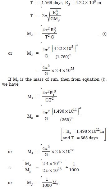 I0, one of satellites of Jupiter, has an orbital period of 1.769 days and the radius of the orbit is 4·22 × 108 m. Show that mass of the Jupiter is about thousandth that of sun.