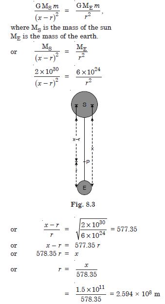 Let P be a point at a distance ‘r’ from the earth where gravitation due to sun and earth is equal and give rise to zero gravitational force.