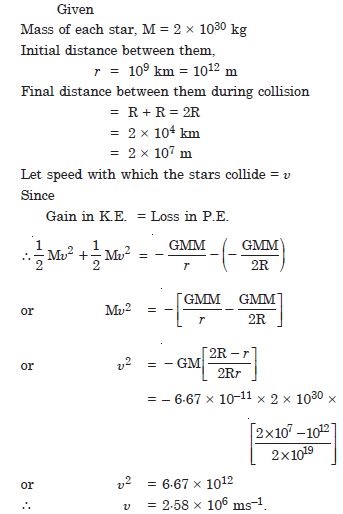 Two stars each of one solar mass (= 2 × 1030 kg) are approaching each other for a head-on collision. When they are at a distance of 109 km, their speeds are negligible. What is the speed with which they collide ? The radius of each star is 104 km. Assume the stars to remain undistorted until they collide. (Use the known value of G).