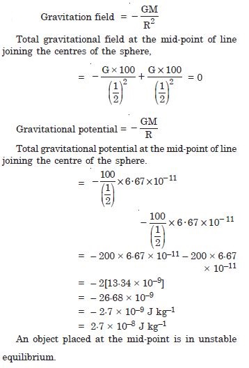 Two heavy spheres each of mass 100 kg and radius 0.10 m are placed 1.0 m apart on a horizontal table. What is the gravitational field and potential at the mid-point of the line joining the centres of the spheres ? Is an object placed at that point in equilibrium ? If so, is the equilibrium stable or unstable ?