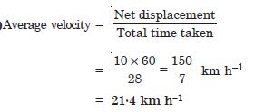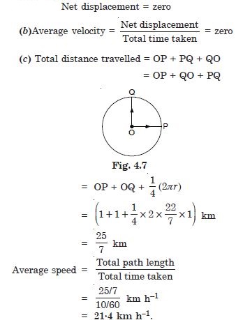 A cyclist starts from the centre O of a circular park of radius 1 km, reaches the edge P of the park, then cycles along the circum-ference, and returns to the centre along QO as shown. If the round trip takes 10 min, what is the (a) net displacement (b) average velocity and (c) average speed of the cyclist ?