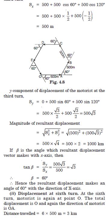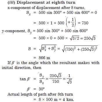 On an open ground, a motorist follows a track that turns to his left by an angle of 60 after every 500 m. Starting from a given turn, specify the displacement of the motorist at the third, sixth and eighth turn. Compare the magnitude of the displacement with the total path length covered by the motorist in each case.