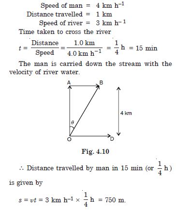 A man can swim with a speed of 4.0 km h–1 in still water. How long does he take to cross a river 1.0 km wide if the river flows steadily at 3.0 km h–1 and he makes his strokes normal to the river current ? How far down the river does he go when he reaches the other bank ?