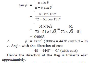 Since the flag flutters in the N-E direction, the wind must be flowing in the S-E direction. Therefore the angle between the wind velocity and the movement of the boat is 135. If b is the angle which the wind velocity makes with east direction, then using the relation
