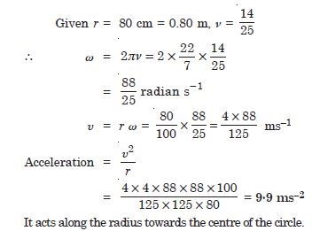 A stone tied to the end of a string 80 cm long is whirled in a horizontal circle with a constant speed. If the stone makes 14 revolutions in 25 s, what is the magnitude and direction of acceleration of the stone ?