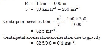 An aircraft executes a horizontal loop of radius 1.00 km with steady speed of 900 km h–1. Compare its centripetal acceleration with the acceleration due to gravity.