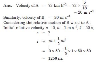 Two trains A and B of length 400 m each are moving on two parallel tracks with a uniform speed of 72 km h–1 in the same direction, with A ahead of B. The driver of B decides to overtake A and accelerates by 1 m s–2. If after 50 s, the guard of B just brushes past the driver of A, what was the original distance between them ?