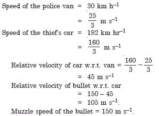 A police van moving on a highway with a speed of 30 km h–1 fires a bullet at a thief’s car speeding away in the same direction with a speed of 192 km h–1. If the muzzle speed of the bullet is 150 ms–1, with what speed does the bullet hit the thief’s car ? (Note : Obtain the speed which is relevant for damaging the thief’s car.)
