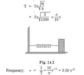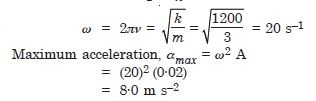 A spring of force constant 1200 Nm–1 is mounted on a horizontal table as shown in Fig. 14.2. A mass of 3·0 kg is attached to the free end of the spring. The mass is then pulled sideways to a distance of 2·0 cm and released. Determine (i) the frequency of oscillations, (ii) maximum acceleration of the mass, and (iii) the maximum speed of the mass.