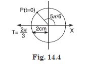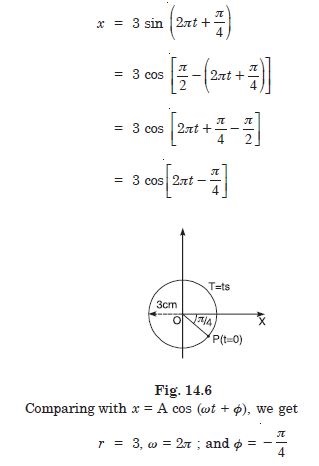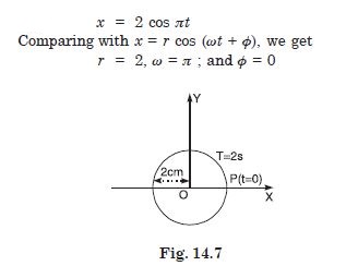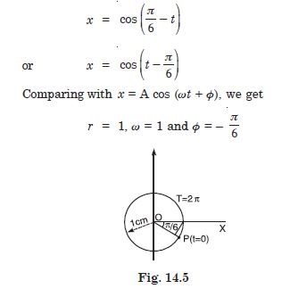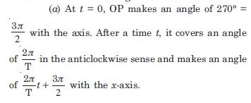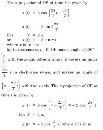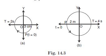 Figure 14.3 below correspond to two circular motions. The radius of the circle, the period of revolution, the initial position, and the period of revolution (i.e. clockwise or anticlockwise) are indicated on each figure. Obtain the corresponding simple harmonic motion of the x-projection of the radius vector of the revolving particle P in each case.