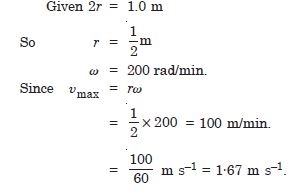 The piston in the cylinder head of a locomotive has a stroke (twice the amplitude) of 1.0 m. If the piston moves with simple harmonic motion with angular frequency of 200 rad/min. What is its minimum speed ?