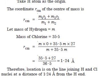 In the HCl molecule, the separation between the nuclei of the two atoms is about 1.27 Å (1 Å = 10–10 m). Find the approximate location of the CM of the molecule, given that a chlorine atom is about 35.5 times as massive as a hydrogen atom and nearly all the mass of an atom is concentrated in its nucleus.