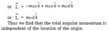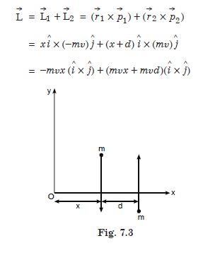 Two particles each of mass m and velocity u travel in opposite directions along parallel lines separated by a distance d. Show that the vector angular momentum of the two particle system is the same whatever be the point about which the angular momentum is taken.