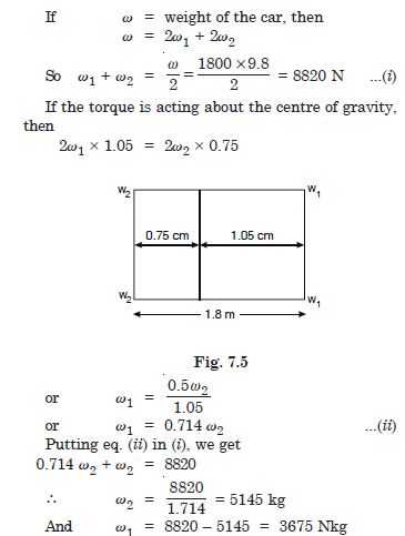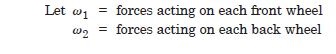 A car weighs 1800 kg. The distance between its front and back axles is 1.8 m. Its centre of gravity is 1.05 m behind the front axle. Determine the force exerted by the level ground on each front wheel and each back wheel.