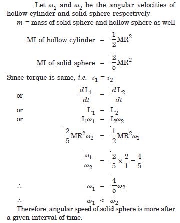 Torques of equal magnitude are applied to a hollow cylinder and a solid sphere, both having the same mass and radius. The cylinder is free to rotate about its standard axis of symmetry, and the sphere is free to rotate about an axis passing through its centre. Which of the two will acquire a greater angular speed after a given time ?