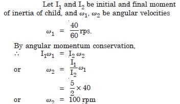 A child stands at the centre of a turn-table with his two arms outstretched. The turn-table is set rotating with an angular speed of 40 rev/min. How much is angular speed of the child if he folds his hands back and thereby reduces his moment of inertia to 2/5 times the initial value ? Assume that the turn-table rotates without friction.