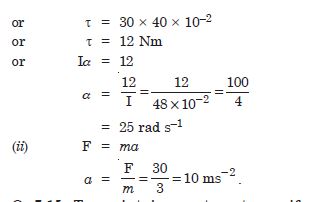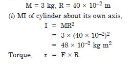 A rope of negligible mass is wound round a hollow cylinder of mass 3 kg and radius 40 cm. What is the angular acceleration of the cylinder if the rope is pulled with a force of 30 N ? What is the linear acceleration of the rope ? Assume that there is no slipping.