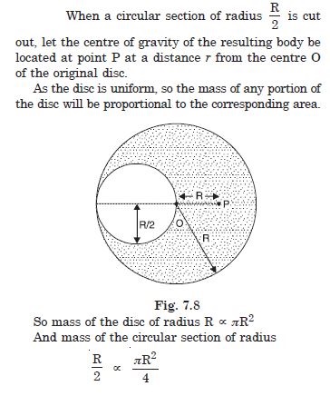 From a uniform disc of radius R, a circular section of radius R/2 is cut out. The centre of the hole is at R/2 from the centre of the original disc. Locate the centre of gravity of the resulting flat body.