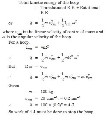 A hoop of radius 2 m weighs 100 kg. It rolls along a horizontal floor so that its centre of mass has a speed of 20 cm s–1. How much work has to be done to stop it ?