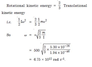 The oxygen molecule has a mass of 5.30 × 10–26 kg and a moment of inertia of 1.94 × 10–46 kg m2 about an axis through its centre perpendicular to the lines joining the two atoms. Suppose the mean speed of such a molecule in a gas is 500 ms–1 and that its kinetic energy of rotation is two-thirds of its kinetic energy of translation. Find the average angular velocity of the molecule.