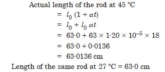 A steel tape 1 metre long is correctly calibrated for temperature of 27·0C. The length of a steel rod measured by this tape is found to be 63·0 cm on a hot day when the temperature is 45C. What is the actual length of the steel rod on that day ? What is the length of the same steel rod on a day when the temperature is 27·0 C ? Coefficient of linear expansion of steel = 1·20 × 10–5 C–1 :