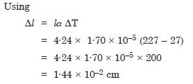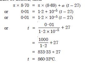 A hole is drilled in a copper sheet. The diameter of the hole is 4·24 cm at 27 C. What is the change in the diameter of the hole when the sheet is heated to 227C ? Coefficient of linear expansion of copper = 1·70 × 105 C–1.
