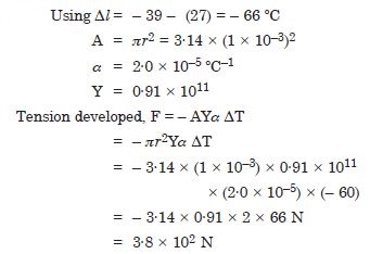 A brass wire 1·8 m long at 27 C is held when taut with little tension between two rigid supports. If the wire is cooled to a temperature – 39 C, what is the tension developed in the wire, if its diameter is 2·0 mm ? Coefficient of linear expansion of brass = 2·0 × 10–5 C–1, Young’s modulus of brass = 0·91 × 1011Pa.