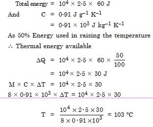 A 10 kW drilling machine is used to drill a bore in a small aluminium block of mass 8.0 kg. How much is the rise in temperature of the block in 2.5 minutes, assuming 50% of power is used up in heating the machine itself or lost to the surroundings. Specific heat of aluminium = 0.91 J g–1 C–1.