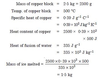 A copper block of mass 2·5 kg is heated in a furnace to a temperature of 500 C and then placed on a large ice block. What is the maximum amount of ice that can melt ? (Specific heat of copper = 0·39 J g–1 C–1, heat of fusion of water = 335 J g–1).